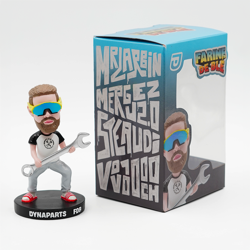 L'iconique figurine bobblehead unique de Farine de Blé 2025, symbole de la collaboration avec la marque performance française Dynaparts. Édition limitée de 100 unités (001-100), c’est l’objet parfait pour les fans de la communauté FDB.